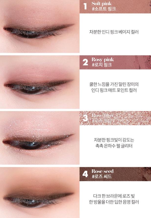 차분한 인디 핑크 베이지 컬러인 소프트 핑크, 쿨한 느낌을 가진 말린 장미의 인디 핑크 매트 포인트 컬러인 로지 핑크, 차분한 핑크빛이 감도는 촉촉 은하수 펄 글리터인 로즈 필터, 다크한 브라운에 로즈빛 한 방울을 더한 딥한 음영 컬러인 로즈 씨드 컬러로 구성되었어요.