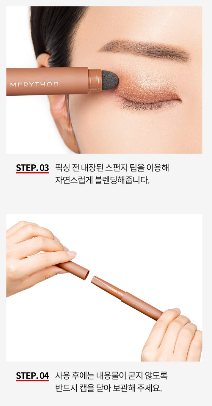 용기를 조금만 돌려 내용물을 1~2mm만 올려준 후 베이스 컬러를, 눈두덩이에 포인트 컬러를 속눈썹 가까이 두고 부드럽게 그려줘요. 픽싱되기 전 내장된 스펀지 팁을 이용해 자연스럽게 블렌딩해주고 사용 후에는 내용물이 굳지 않도록 캡을 닫아 보관해주세요.