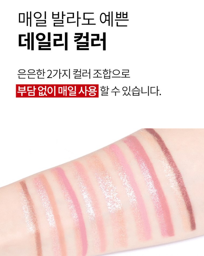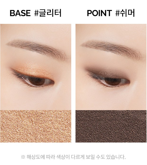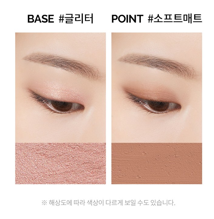 베이스 컬러와 포인트 컬러를 2:1 비율로 발라 데일리 메이크업을 연출하거나, 1:1 비율로 발라 세미 스모키 메이크업을 연출할 수 있어요.