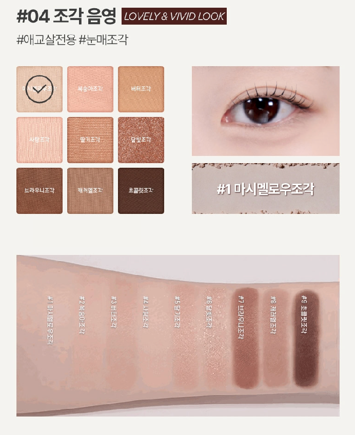 이것도 역시 웜톤분들에게 추천드리는 색상이에요. 애교살 전용으로 사용하기 좋고 자연스러운 음영으로 눈매를 교정해주기 좋아요. 우측 눈은 1번 마시멜로우조각 컬러를 발색한 사진이고, 아래는 전색상 피부 발색샷이에요. 마시멜로우조각, 복숭아조각, 버터조각, 사탕조각, 딸기조각, 달빛조각, 브라우니조각, 캐러멜조각, 초콜릿조각으로 구성되어 있어요!