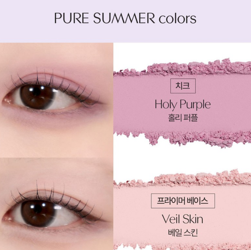 치크 컬러 홀리 퍼플, 프라이머 베이스 베일 스킨, 포인트 컬러 페어리 플럼, 투명 글리터 아이스 로드, 쉐딩/음영 다크 리버 컬러로 구성되어 있어요! 보라빛의 느낌이 예쁜 팔레트예요:)