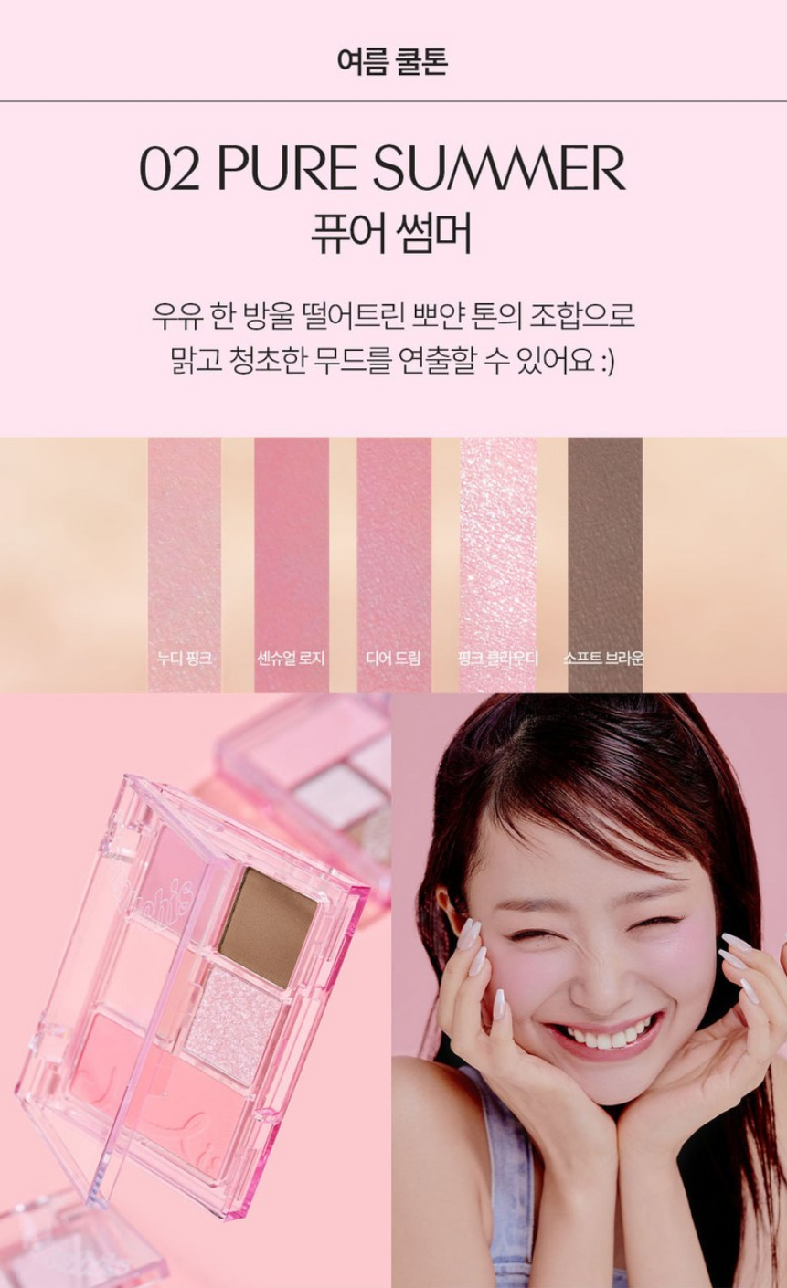 우유 한 방울 떨어트린 뽀얀 톤의 조합으로 맑고 청초한 무드를 연출할 수 있는 팔레트예요. 누디 핑크, 센슈얼 로지, 디어 드림, 핑크 클라우디, 소프트 브라운으로 구성되어 있고 여름쿨톤 분들에게 추천드려요!