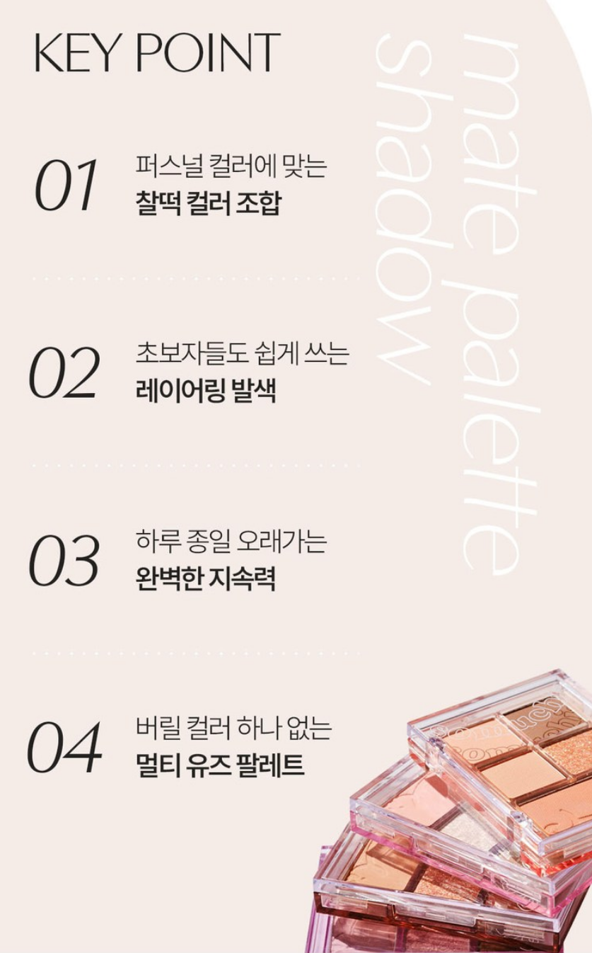 퍼스널 컬러에 맞는 찰떡 컬러 조합, 초보자들도 쉽게 쓰는 레이어링 발색, 하루 종일 오래가는 완벽한 지속력, 버릴 컬러 하나 없는 멀티 유즈 팔레트라는 점이 포인트예요!
