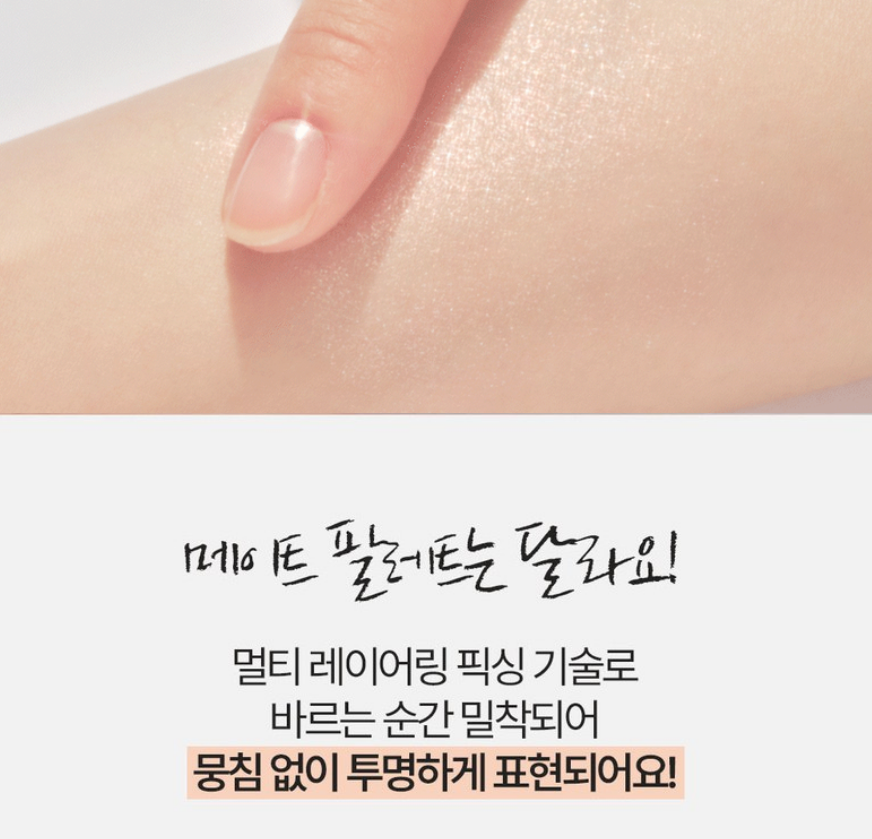 멀티 레이어링 픽싱 기술로 바르는 순간 밀착되어 뭉침 없이 투명하게 표현되기 때문에 글리터를 쓸 때 뭉치는 것을 걱정하지 않아도 된답니다!