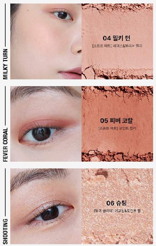 소프트 매트 타입인 베이스&블러셔 컬러 4호 밀키 턴, 포인트 컬러로 사용하는 5호 피버 코랄, 듀이 글리터 타입의 애교살&포인트 펄 6호 슈팅이에요.