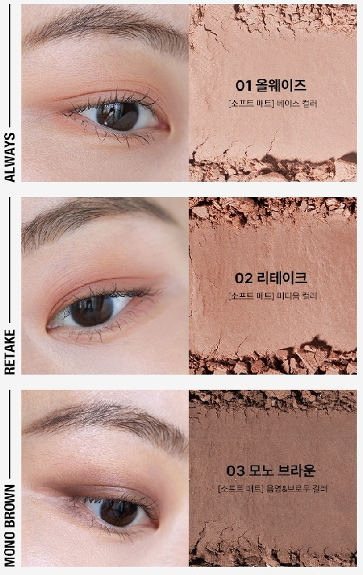 소프트 매트 타입 베이스 컬러 1호 올웨이즈, 미디움 컬러 2호 리테이크, 음영&브로우 컬러 3호 모노 브라운이에요!