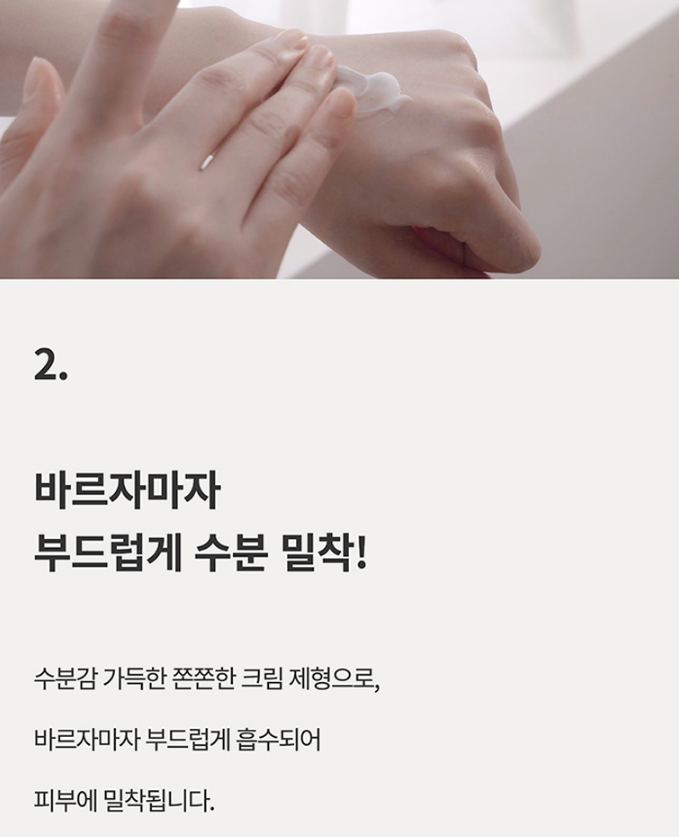 수분감이 가득한 쫀쫀한 크림 제형이며 바르자마자 부드럽게 흡수되는 점도예요. 끈적임 없이 피부에 수분이 쫀쫀하게 밀착되는 발림성을 가지고 있고, 유백색에 무향 제품이랍니다.