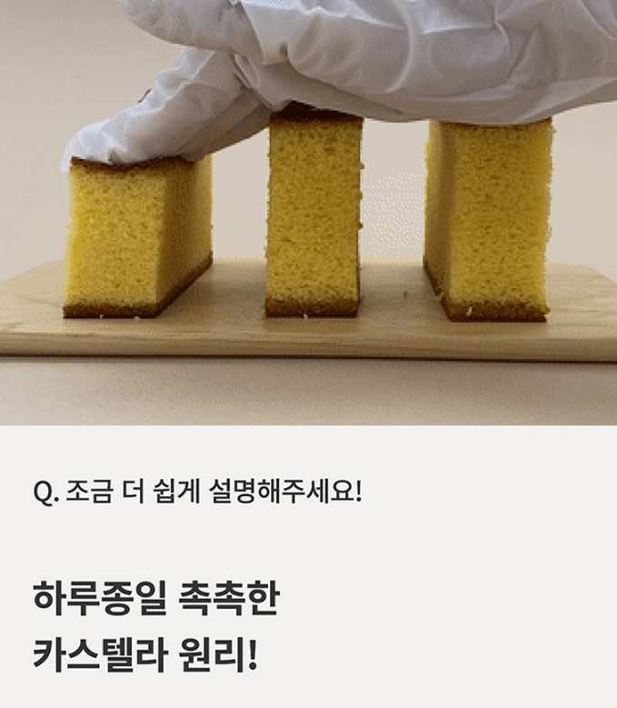 피부 컨디션에 따라 매 계절 수분크림을 바꾼 경험이 있으신가요? 피부 친화적이면서 가장 근본의 수분을 잡아주는 4계절 내내 사용할 수 있는 수분크림을 만들기 위해 연구를 시작하여 하루종일 촉촉한 카스텔라 성분에서 레시피를 찾았다고 해요.