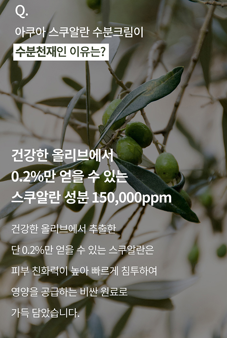 건강한 올리브에서 0.2%만 얻을 수 있는 스쿠알란 성분 150,000ppm이 함유되어 있어요. 피부 친화력이 높아 빠르게 침투하여 영양을 공급하는 비싼 원료를 가득 담았답니다.