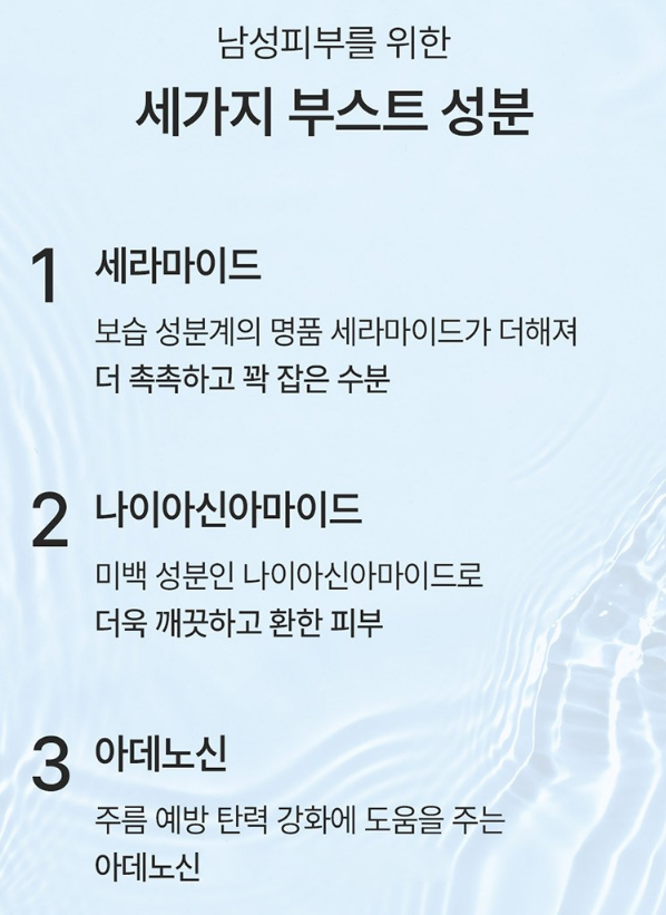 특히 관리를 시작한 지 얼마 안 된 남성분들은 어떤 제품을 써야하는지 감도 안 오는 경우가 많아요. 그래서 단순히 가성비 좋은 수분크림으로 저렴한 걸로 구매하시는 분들도 많더라구요.