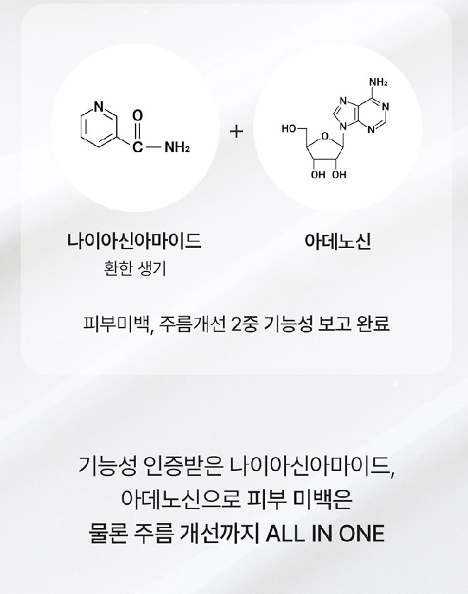 나이아신아마이드와 아데노신으로 피부미백, 주름개선 2중 기능성 보고를 완료했어요.