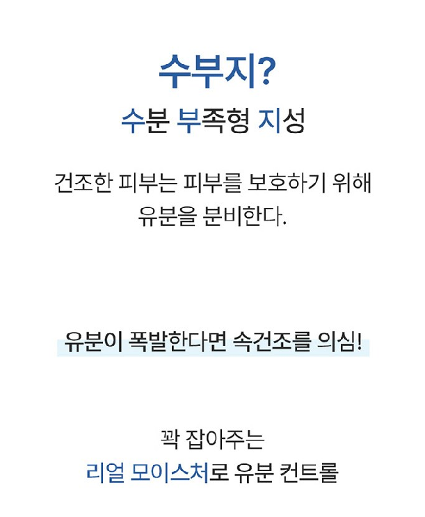 수부지란 수분 부족형 지성의 줄임말이에요. 건조한 피부는 피부를 보호하기 위해 유분을 분비하는데, 건조함을 느끼면서도 유분이 폭발한다면 속건조를 의심해볼 필요가 있어요. 다슈 올인원 크림은 꽉 잡아주는 리얼 모이스처로 유분을 컨트롤해준답니다.