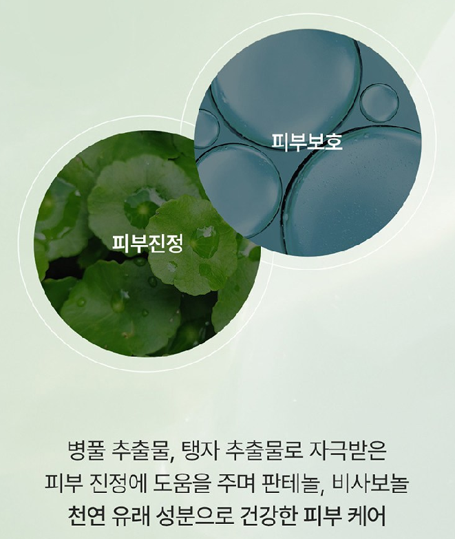 병풀 추출물, 탱자 추출물로 자극받은 피부 진정에 도움을 주며 판테놀, 비사보놀 천연 유래 성분으로 건강한 피부로 케어해줘요.