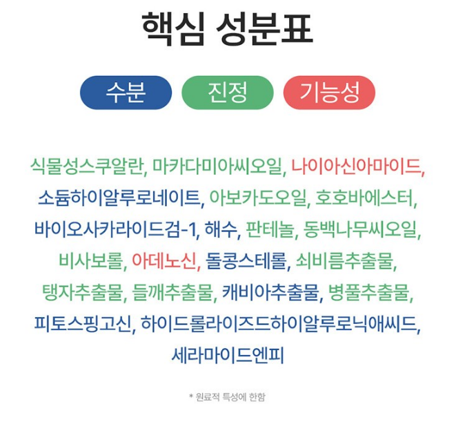 핵심 성분표예요. 파란색은 수분공급에, 초록색은 진정에, 빨간색은 기능성에 도움을 주는 성분이랍니다:)