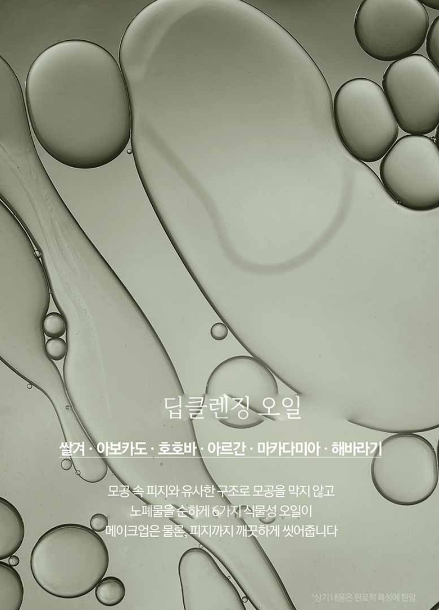 쌀겨, 아보카도, 호호바, 아르간, 마카다미아, 해바라기 6가지 식물성 오일이 모공 속 피지와 유사한 구조로 모공을 막지 않고 노폐물을 순하게 녹여줘요. 메이크업은 물론 피지까지 깨끗하게 씻어준답니다.