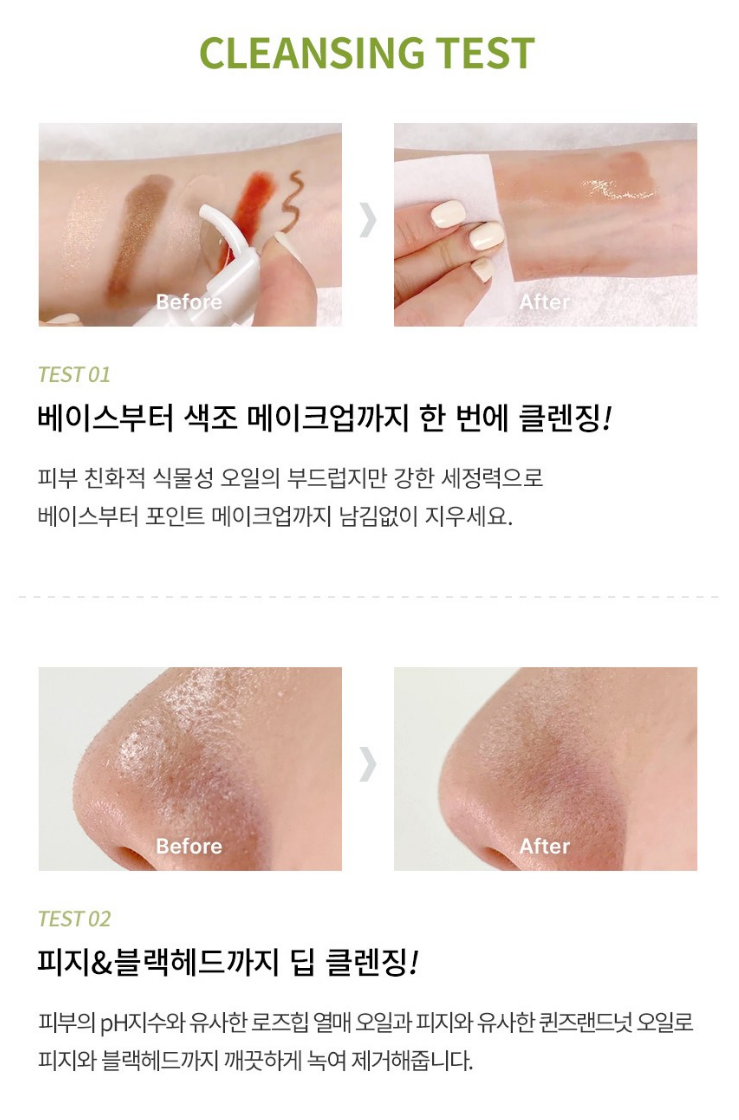 피부 친화적 식물성 오일의 부드럽지만 강한 세정력으로 베이스부터 포인트 메이크업까지 남김없이 지워줘요. 그리고 피부의 pH지수와 유사한 로즈힙 열매 오일과 피지와 유사한 퀸즈랜드넛 오일로 피지와 블랙헤드까지 녹여 제거해준답니다.