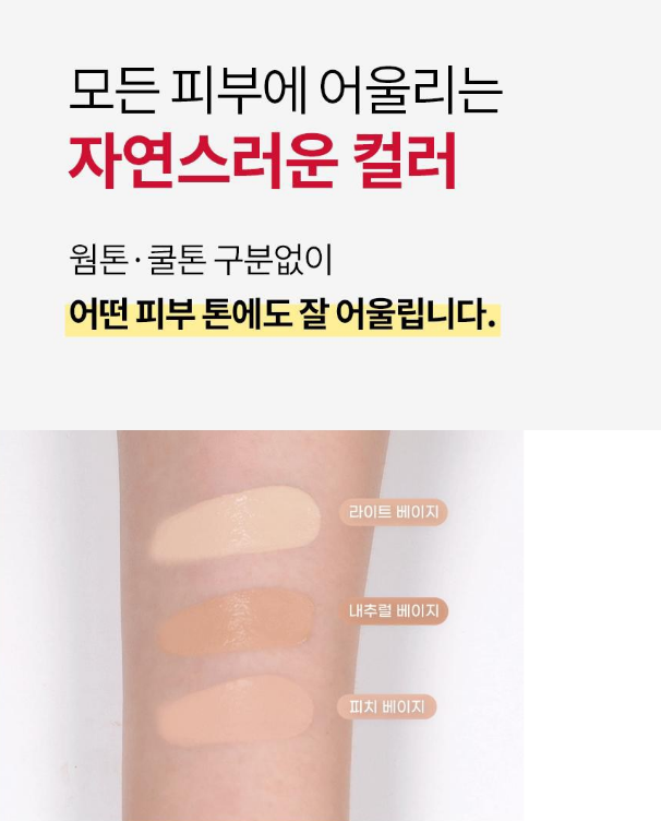 라이트 베이지는 잡티, 칙칙한 부위, 국소부위 커버, 하이라이터, 립 베이스에 활용할 수 있고, 내추럴 베이지는 트러블, 모공 커버, 컨투어링 등에 활용할 수 있으며 피치 베이지는 다크서클, 잡티, 홍조, 입가, 눈가 커버에 활용할 수 있어요.