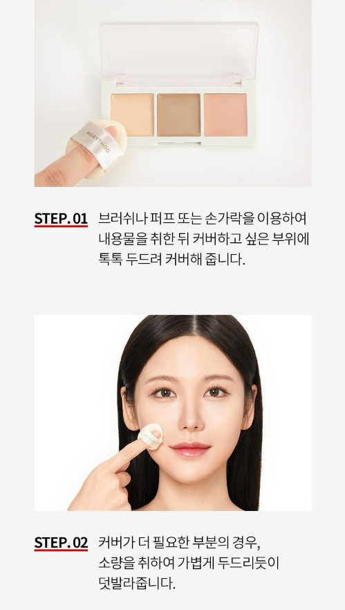 브러쉬나 퍼프 또는 손가락을 이용하여 내용물을 취한 뒤 커버하고 싶은 부위에 톡톡 두드려 커버주고, 커버가 더 필요한 부분은 소량을 취하여 가볍게 덧바라주면 된답니다.
