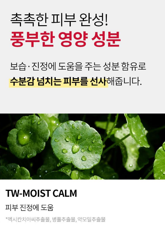 보습, 진정에 도움을 주는 성분 함유로 수분감 넘치는 피부를 선사해줘요. TW-MOIST CALM 성분 함유로 피부 진정에 도움을 준답니다.