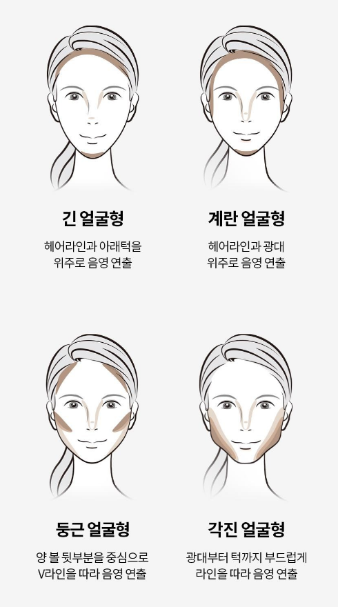 얼굴형에 따른 쉐딩 위치 팁이에요! 긴 얼굴형은 헤어라인과 아래턱 위주로 음영을 연출하고, 계란형은 헤어라인과 광대 위주, 둥근 얼굴형은 양 볼 뒷부분을 중심으로 v라인을 따라 음영 연출, 각진 얼굴형은 광대부터 턱까지 부드럽게 라인을 따라 음영을 연출해주면 좋답니다!