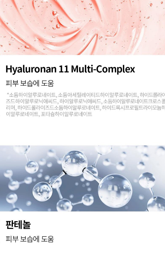 Hyaluronan 11 Multi-Complex 성분과 판테놀이 피부 보습에 도움을 준답니다.