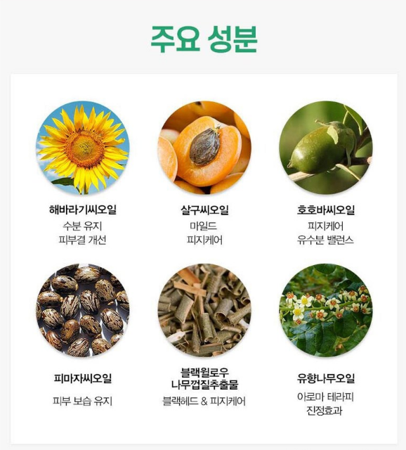 해바라기씨 오일, 살구씨 오일, 호호바씨 오일, 피마자씨 오일, 블랙월로우 나무껍질 추출물, 유향나무 오일 성분이 피부 보습과 수분을 유지해주소, 피지 케어에 도움을 줘요.
