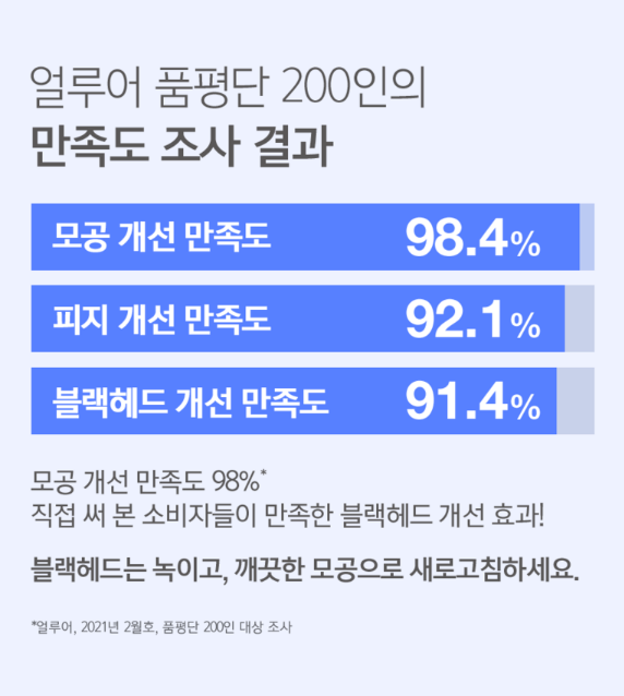 얼루어 품평단 200인 만족도 조사 결과, 모공 개선 만족도가 98%일 만큼 직접 써 본 소비자들이 블랙헤드 개선 효과에 매우 만족했음을 알 수 있어요.