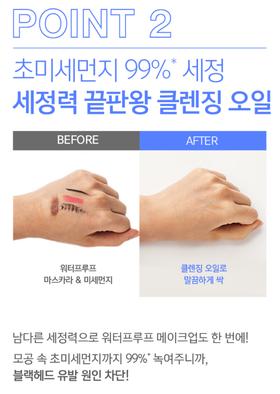 남다른 세정력으로 워터프루프 메이크업도 한 번에 지울 수 있어요. 또한, 모공 속 초미세먼지까지 99% 녹여주기 때문에 블랙헤드 유발 원인을 차단하는데 도움을 줘요.