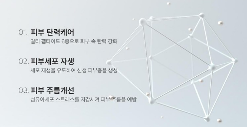 멀티 펩타이드 6종으로 피부 탄력 케어, 세포 재생을 유도하여 신생 피부층을 생성해주며 섬유아세포 스트레스를 저감시켜 피부 주름을 예방, 개선해줘요.