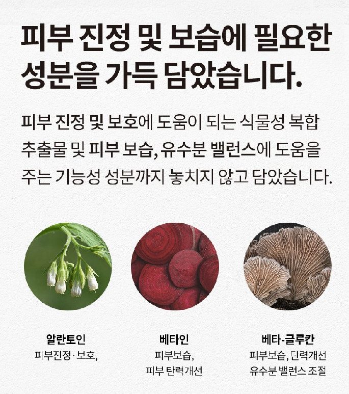피부 진정 및 보호에 도움이 되는 식물성 복합추출물 및 피부보습, 유수분 밸런스에 도움을 주는 기능성 성분까지 놓치지 않고 담았어요. 주요 성분으로는 피부 진정및 보호를 돕는 알란토인, 피부 보습과 탄력개선을 돕는 베타인, 피부 보습과 탄력개선 및 유수분 밸런스 조절을 돕는 베타-글루칸이 함유되어 있답니다.