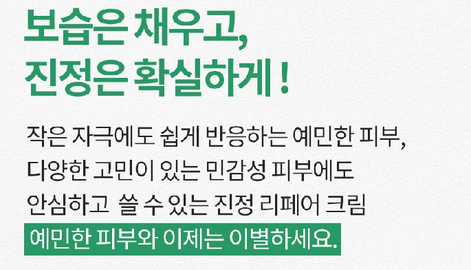 작은 자극에도 쉽게 반응하는 예민한 피부, 다양한 고민이 있는 민감성 피부에도 안심하고 쓸 수 있는 진정 리페어 크림이에요. 보습은 채우면서도 진정은 확실하게 해줘요! 예민한 피부와 이제는 이별해보세요~!