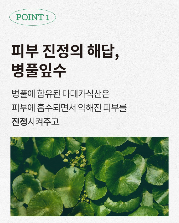 병풀에 함유된 마데카식산은 피부에 흡수되면서 약해진 피부를 진정시켜줘요!