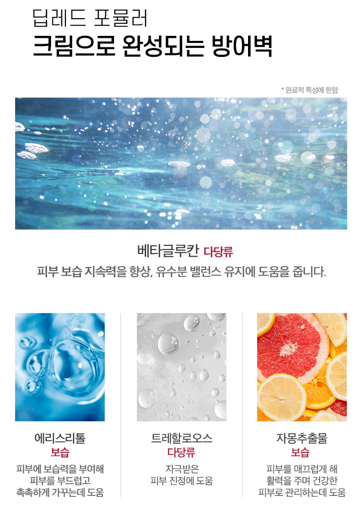 피부 보습 지속력을 향상하며 유수분 밸러스 유지에 도움을 주는 베타글루칸, 보습력을 부여해 피부를 부드럽고 촉촉하게 가꿔주는 에리스리톨, 피부 진정에 도움을 주는 트레할로오스, 피부를 매끄럽게 하여 활력을 주며 건강한 피부로 관리하는데 도움을 주는 자몽추출물이 함유된 딥레드 포뮬러로 완벽한 피부 방어벽을 완성해보세요!